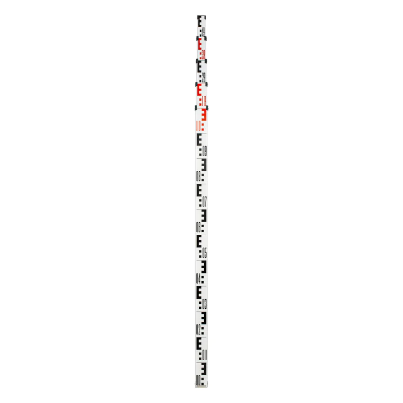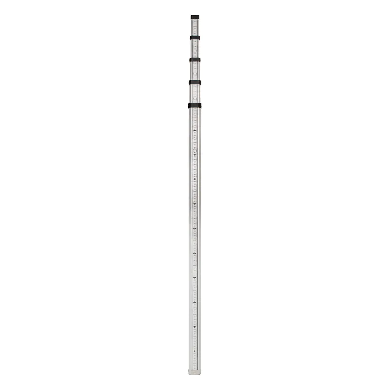 Телескопическая рейка состоит из пяти выдвижных секций, раскладывается до 5 м, имеет Е-шкалу и миллиметровую градуировку. Погрешность измерений не превышает 1 мм. Пузырьковый уровень упрощает выравнивание прибора.