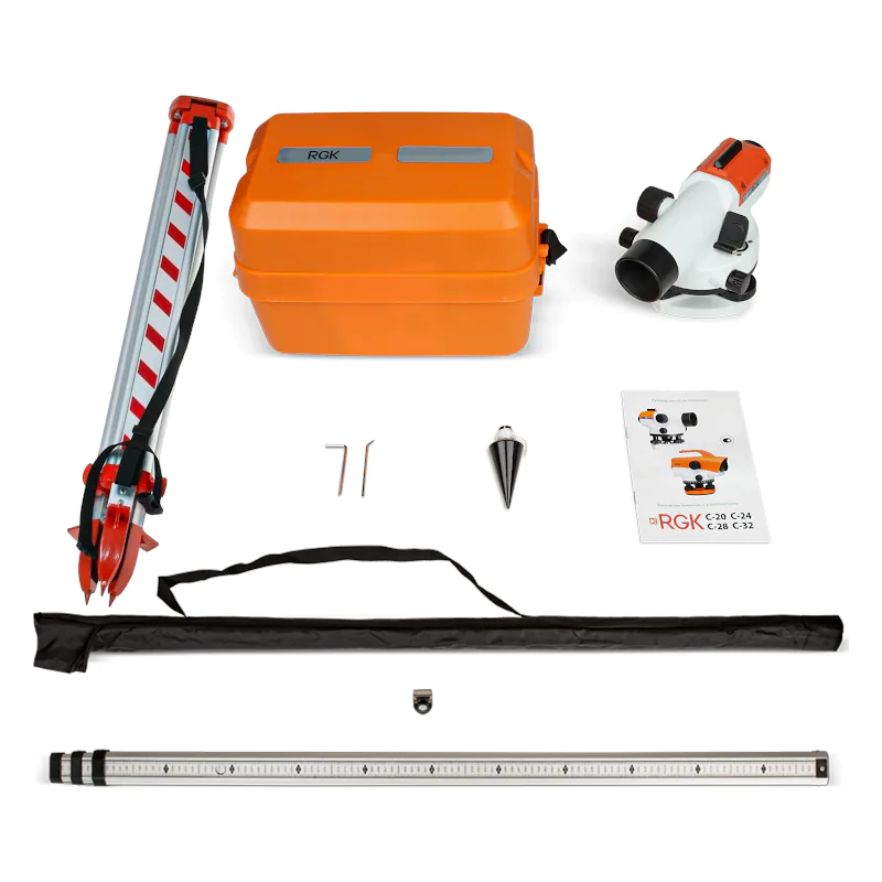 Оптический нивелир RGK C-24 с поверкой, рейка AMO S5 и штатив S6-N — комплект измерительных приборов для строительных, геодезических, инженерных и дорожных работ. Совместное использование инструментов и принадлежностей из набора обеспечивает высокую точность результата.
