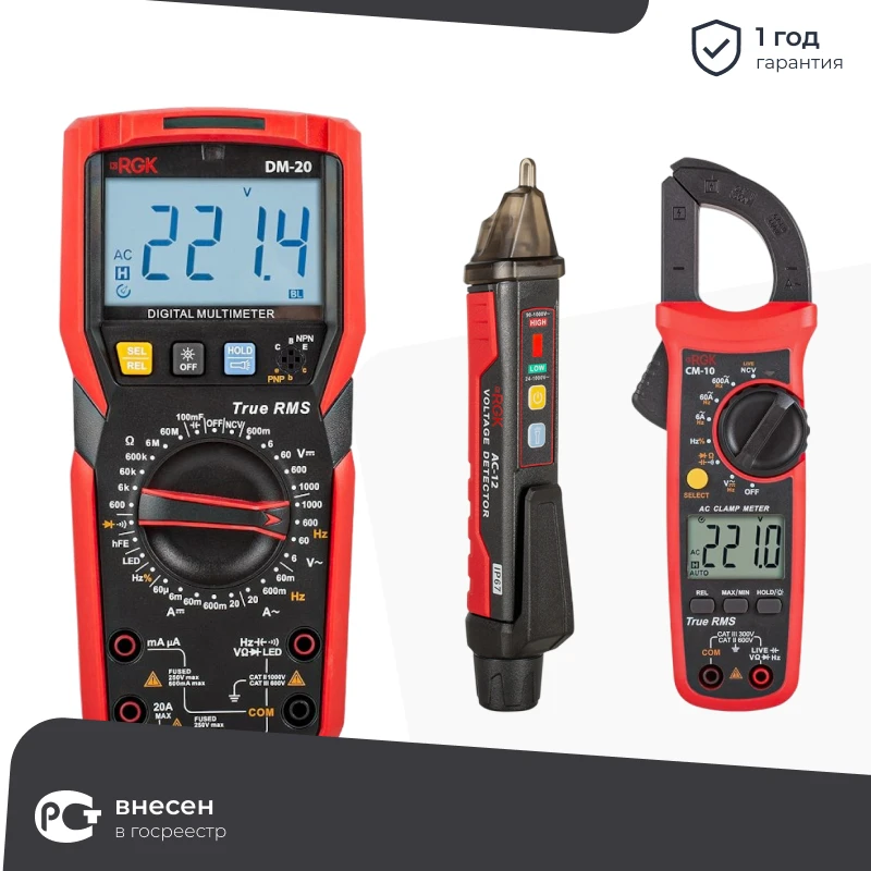 RGK DM-20 цифровой мультиметр с токовыми клещами CM-10 и индикатором напряжения AC-12, 776455/776417/776394
