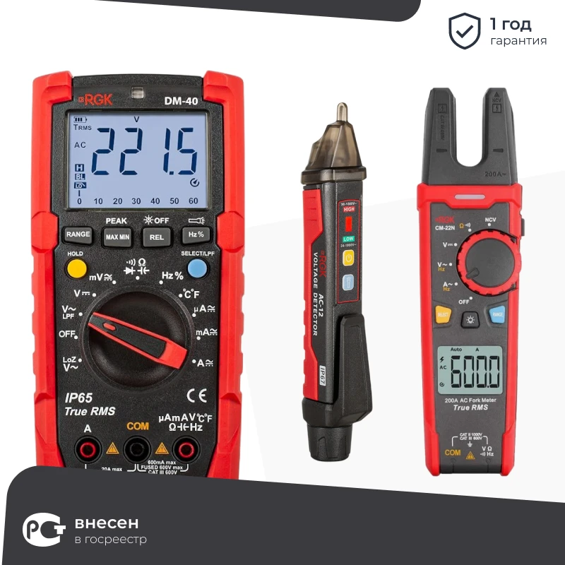 RGK DM-40 цифровой мультиметр с токовыми клещами CM-22N и индикатором напряжения AC-12, 776431/755146/776394