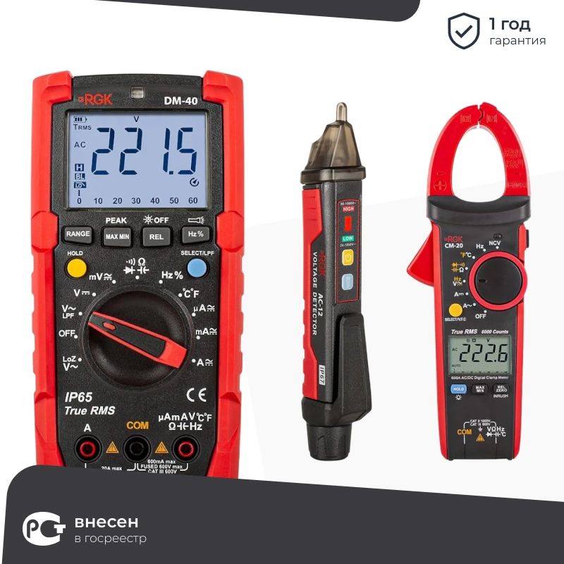 RGK DM-40 цифровой мультиметр с токовыми клещами CM-20 и индикатором напряжения AC-12, 776431/776424/776394