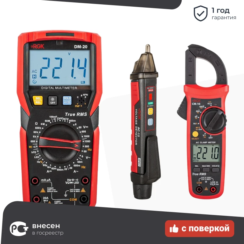 RGK DM-20 цифровой мультиметр с поверкой, с токовыми клещами CM-10 и индикатором напряжения AC-12 779647/779678/776394