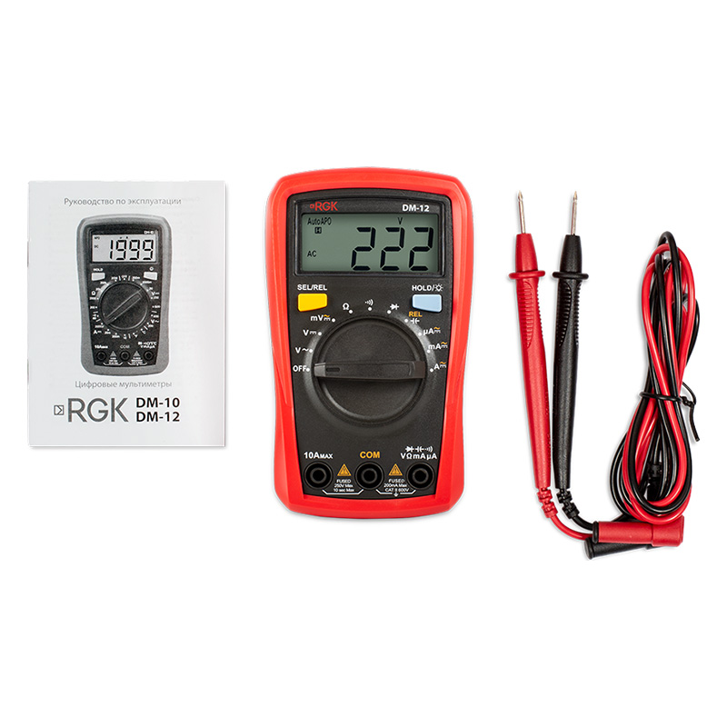 Цифровой мультиметр RGK DM-12 – прибор для измерения различных параметров электросети, от напряжения в диапазоне 200 мВ - 600 В до сопротивления 200 Ом - 200 МОм. Переносная модель поставляется в комплекте с измерительным кабелем с пробниками.