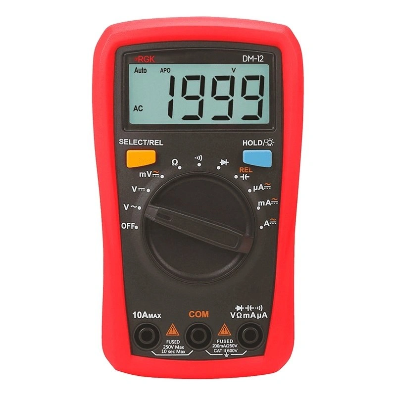 Цифровой мультиметр RGK DM-12 — удобный и компактный многофункциональный измерительный прибор. Используется для измерения напряжения, частоты, силы постоянного и переменного тока, сопротивления, емкости, а также проверки работоспособности цепей и диодов. Находит широкое применение в мастерских и сервисных центрах по ремонту электронного оборудования. Работает от входящих в комплект поставки двух батареек ААА напряжением 1,5 В. Устройство зарегистрировано в государственном реестре средств измерений под номером 81409-21. Поставляется в чехле вместе с комплектом измерительных проводов.