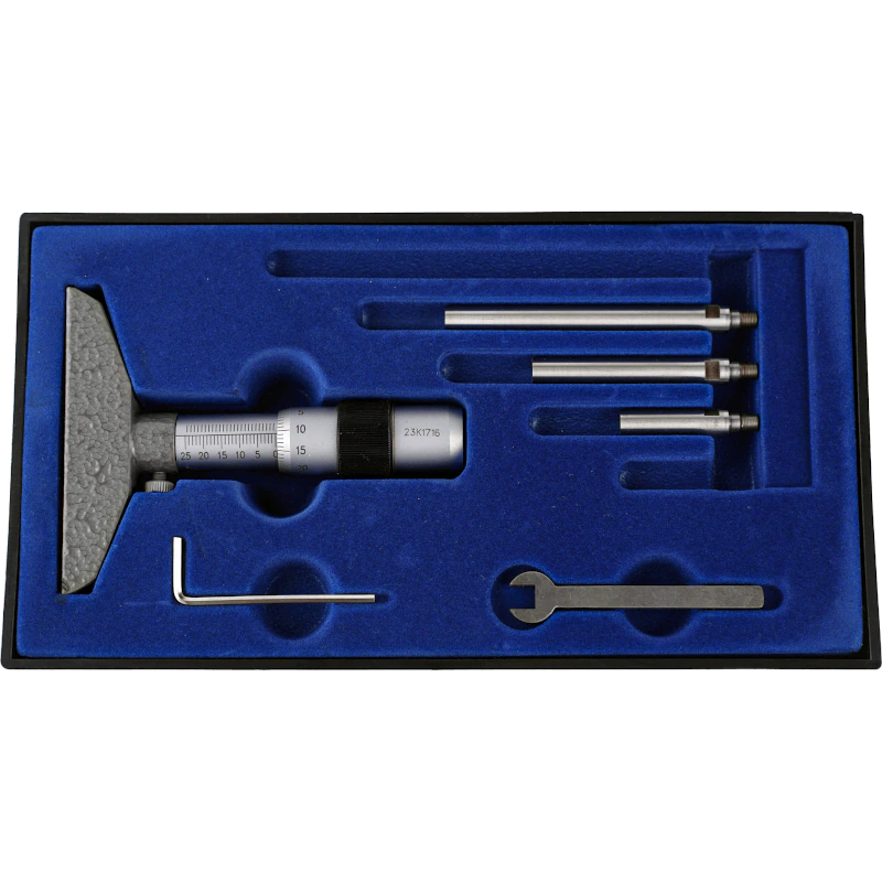 Микрометрический глубиномер RGK GM-100 — механический прибор, применяемый для контроля качества, выявления дефектов и проверки допусков при обработке металлических заготовок или калибровке оборудования. Диапазон измерения глубины составляет от 0 до 100 мм. Прибор поставляется в кейсе для удобства хранения вместе с измерительными стержнями и рабочими инструментами.