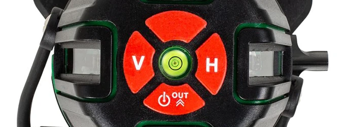 Построитель имеет три кнопки для поочередной активации горизонтальных и вертикальных лучей. Это значительно упрощает работу и экономит заряд аккумулятора. Трегер с регулируемыми металлическими ножками обеспечивает устойчивость прибора. Световые линии автоматически выравниваются по горизонту при отклонении нивелира на ±4º.