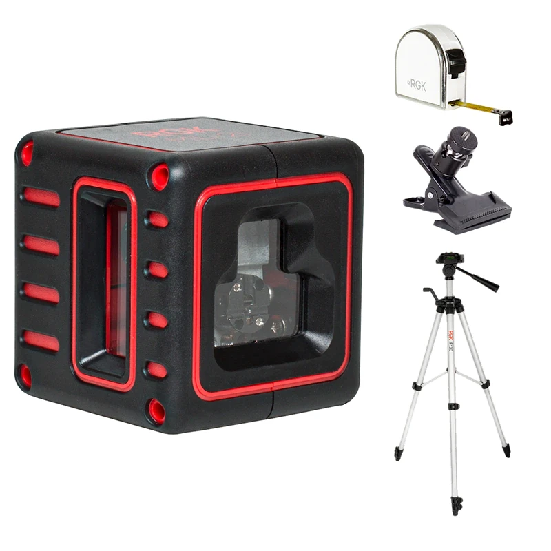 В комплект поставки входят рулетка, крепление и штатив. Рулетка RM3 в ударопрочном корпусе позволяет измерять расстояния до 3 м. Штатив А-130 изготовлен из прочного и легкого алюминиевого сплава. Платформа плавно поднимается на высоту до 1,3 м. Универсальное крепление К-5 позволяет фиксировать прибор на строительных конструкциях с помощью клипсы с резиновыми накладками.