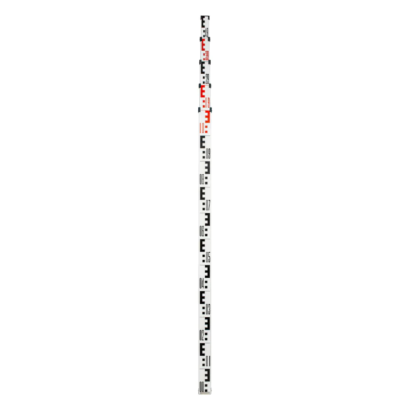 Для определения разности высот необходимо сфокусировать нивелир на геодезической рейке. В этом комплекте предусмотрен измерительный инструмент, состоящий из пяти последовательно выдвигаемых секций. Их общая высота составляет 5 м. Миллиметровая шкала и Е-градуировка хорошо считываются на большом расстоянии. Погрешность измерений не превышает 1 мм. Для выравнивания рейки АМO S5 по вертикали предусмотрен пузырьковый уровень. Конструкция из алюминия устойчива к коррозии, шкалы не стираются и не выгорают. Чтобы вам было удобно переносить результаты измерений в проект и работать с одинаковыми высотами, на рейке предусмотрена металлизированная кнопка для фиксации секции на нужном уровне.