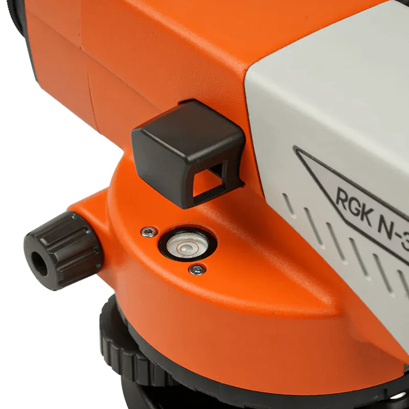 Работать с прибором легко и удобно. Винты наводки и фокусировки с нескользящей резиновой поверхностью имеют плавный ход. Зеркальце для наблюдения за круглым уровнем упрощает процесс выравнивания нивелира.