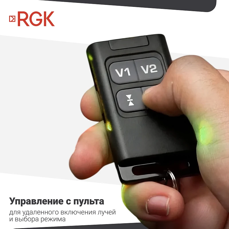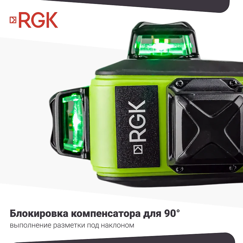 Функция выравнивания лучей пригодится, если в помещении кривой пол. В этом случае, если лазерный нивелир RGK PR-3G будет наклонен сильнее допустимого диапазона, то сработает сигнализация. Лазерные линии начинают мигать. Блокировка компенсатора позволяет отключать эту функцию, чтобы безопасно транспортировать прибор, а также проецировать лучи под наклоном.