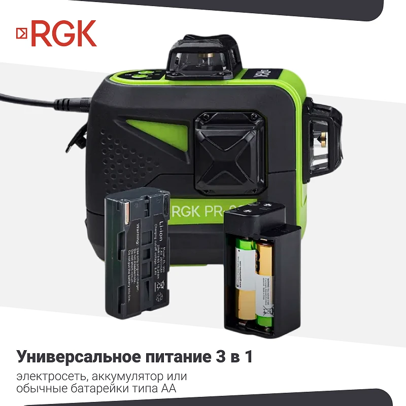 Лазерный построитель плоскостей питается от Li-Ion аккумулятора. Его мощности хватает до 8 ч непрерывной работы.