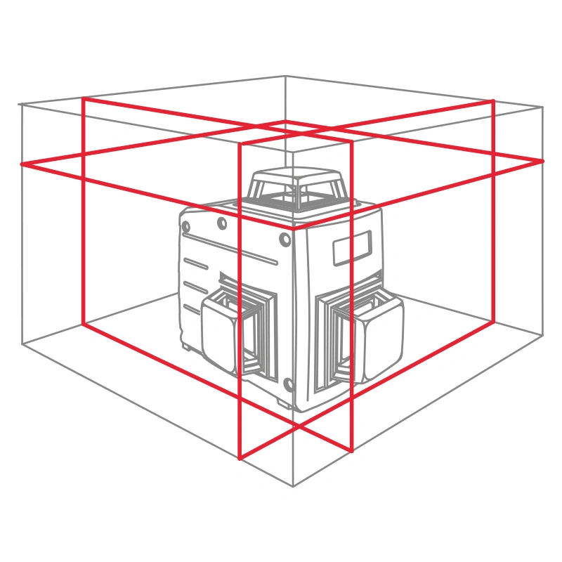 Одна горизонтальная и две вертикальные плоскости, перпендикулярные друг другу, позволяют выполнять разметку по всему помещению без перестановки прибора. Это удобно для укладки напольных покрытий, монтажа перегородок, потолков, установки дверей, окон, прокладки коммуникаций и других строительных задач.