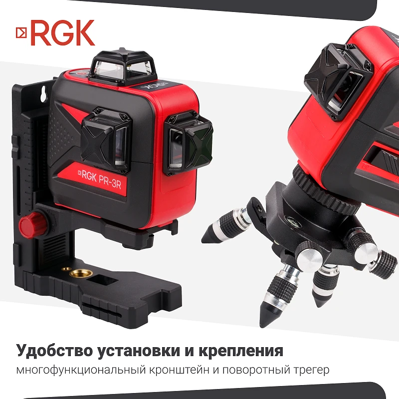 Лазерный нивелир RGK PR-3R подходит для установки на штатив, треногу или платформу с резьбой 5/8" или 1/4 ". Это позволит проецировать лазерные линии на заданной высоте или на уровне плинтуса при использовании небольшой подставки.