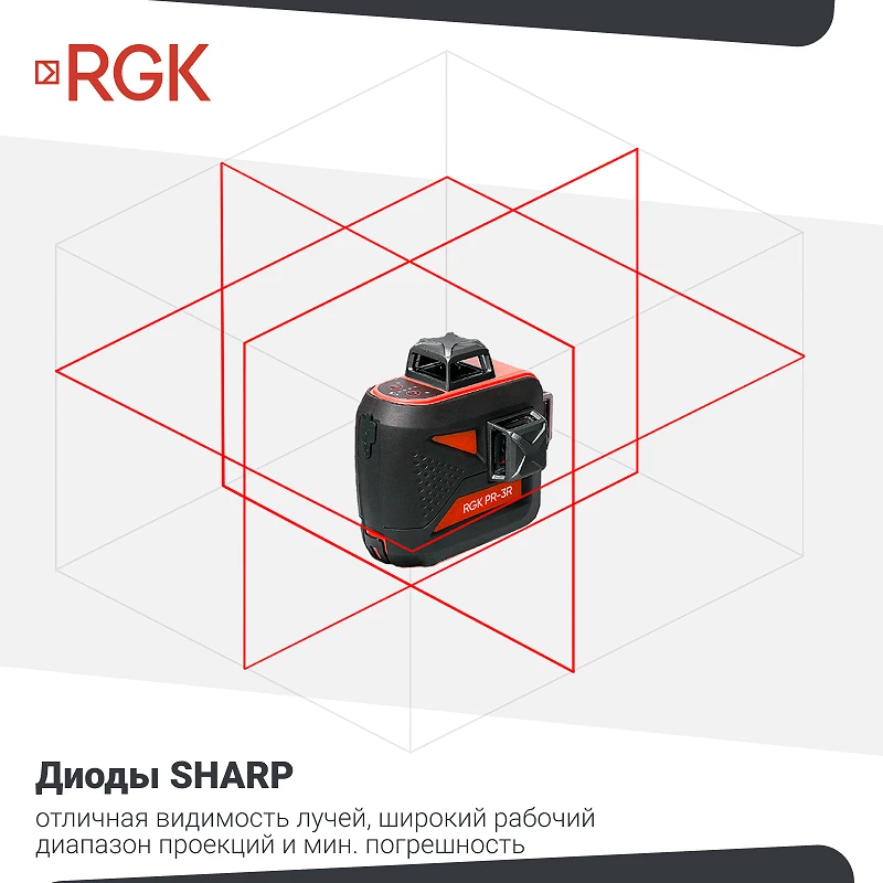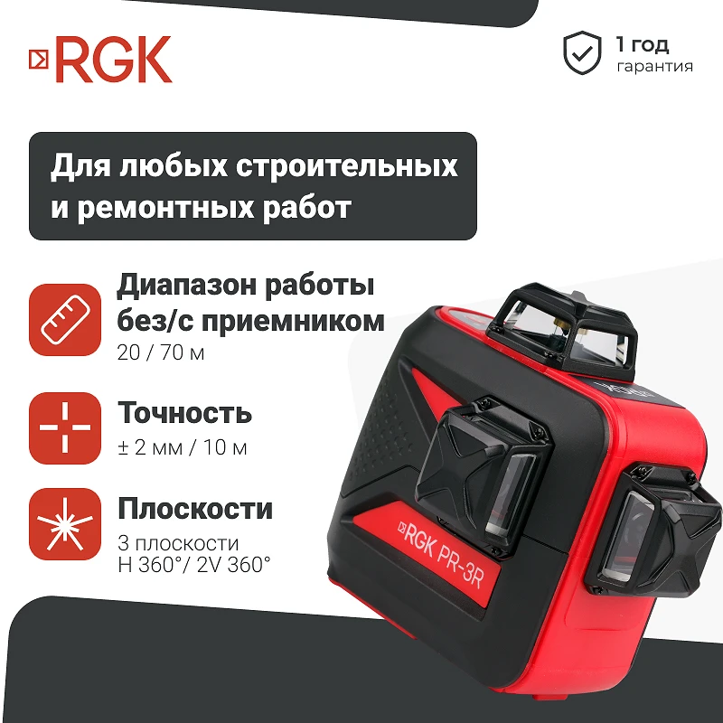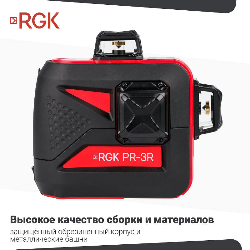 Лазерный нивелир RGK PR-3R с разверткой на 360 ° проецирует горизонтальную и 2 вертикальных линии. Для полноценной работы на корпусе есть две резьбы под штатив, режим работы с приемником, а также комплект дополнительных аксессуаров.