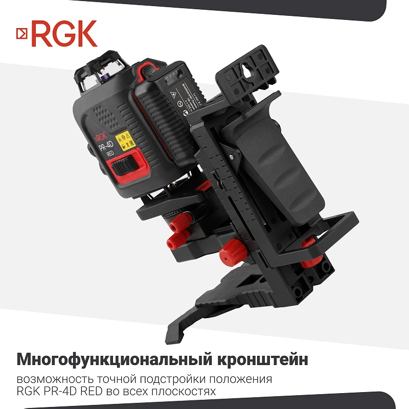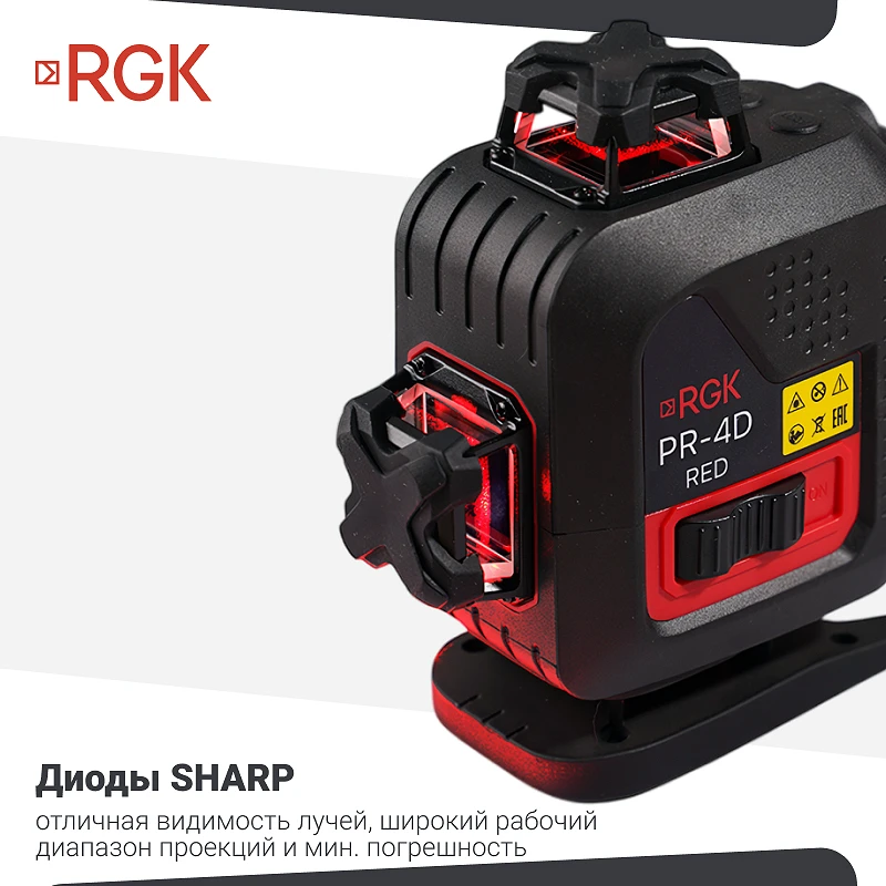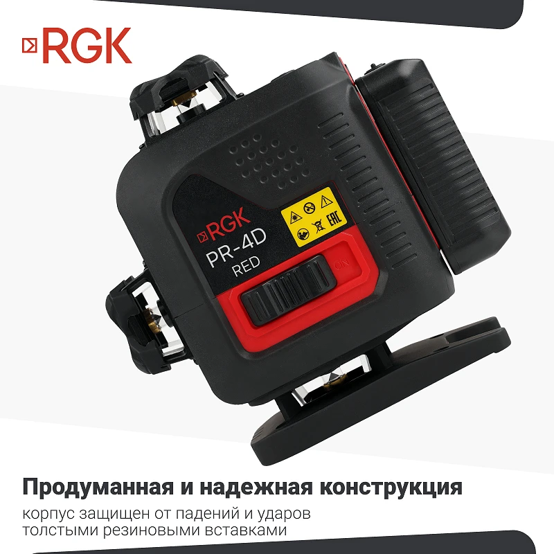 RGK PR-4D Red защищен по периметру: плотный пластик, толстые резиновые вставки и металлические излучатели выдерживают удары, вибрации и падения. Класс защиты IP54 позволяет спокойно работать в пыльных помещениях или при наличии мелких брызг воды. Прибор устойчиво стоит, не скользит, не подведет.