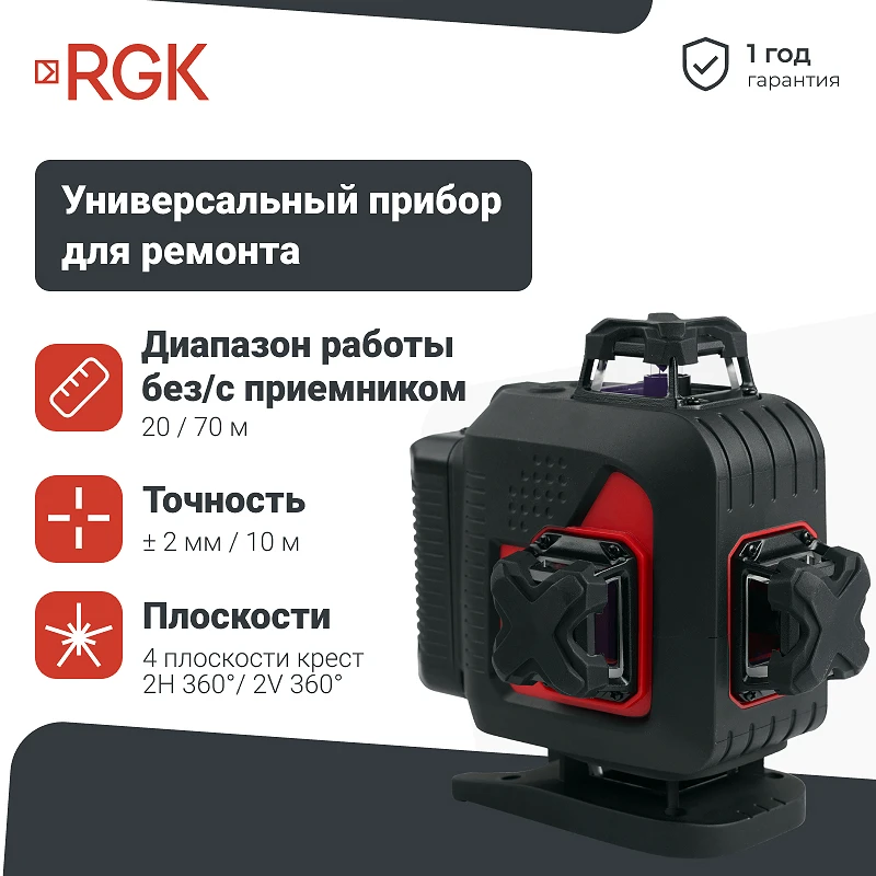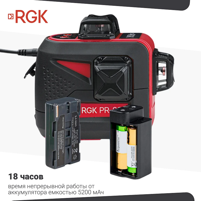 Лазерный уровень RGK PR-4D Red проецирует четыре линии с разверткой 360°. Лучи красного цвета охватывают все помещение и позволяют выполнить разметку стен, потолка, перегородок и проемов, не меняя положения прибора. Нивелир укомплектован Li-Ion аккумулятором, полного заряда которого хватает на 8 часов непрерывной работы всех излучателей.