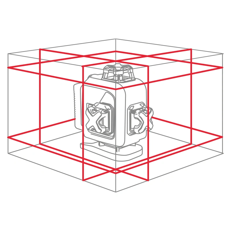 Две горизонтальные линии и две вертикали позволяют выстраивать идеально точную геометрию на полу, стенах и потолке. Линии проходят максимально низко и высоко — это удобно при укладке плитки, заливке полов, отделке потолков и выравнивании перегородок. Один прибор помогает решать все задачи.