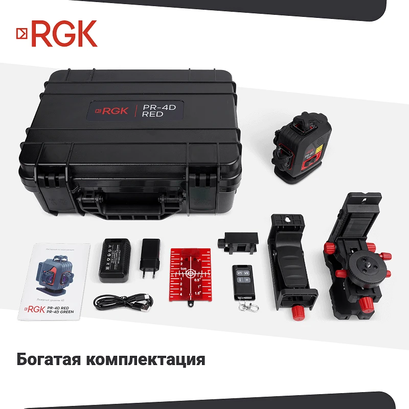 Нивелир RGK PR-4D Red с резьбой 1/4" можно установить на штатив для более точного выставления углов. Входящие в комплект кронштейны и магнитные держатели упрощают крепление прибора при выполнении разных задач. Работать на большом строительном объекте будет удобнее благодаря пульту дистанционного управления и мишени. Уровень и принадлежности поставляются в кейсе. Состояние аккумулятора удобно отслеживать по индикатору уровня заряда. Кабель USB Type-C позволяет заряжать прибор от электросети или пауэрбанка, при этом не обязательно прерывать работу.
