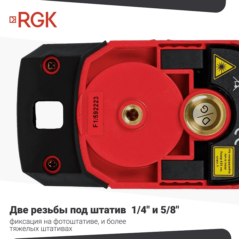 На корпусе есть две резьбы под штатив. Крепление типа 1/4 " подходит для стандартных штативов. Разъем 5/8 " подходит к большинству геодезических треног. Это поможет проецировать лазерные линии на определенной высоте и плавно поворачивать прибор вокруг своей оси.