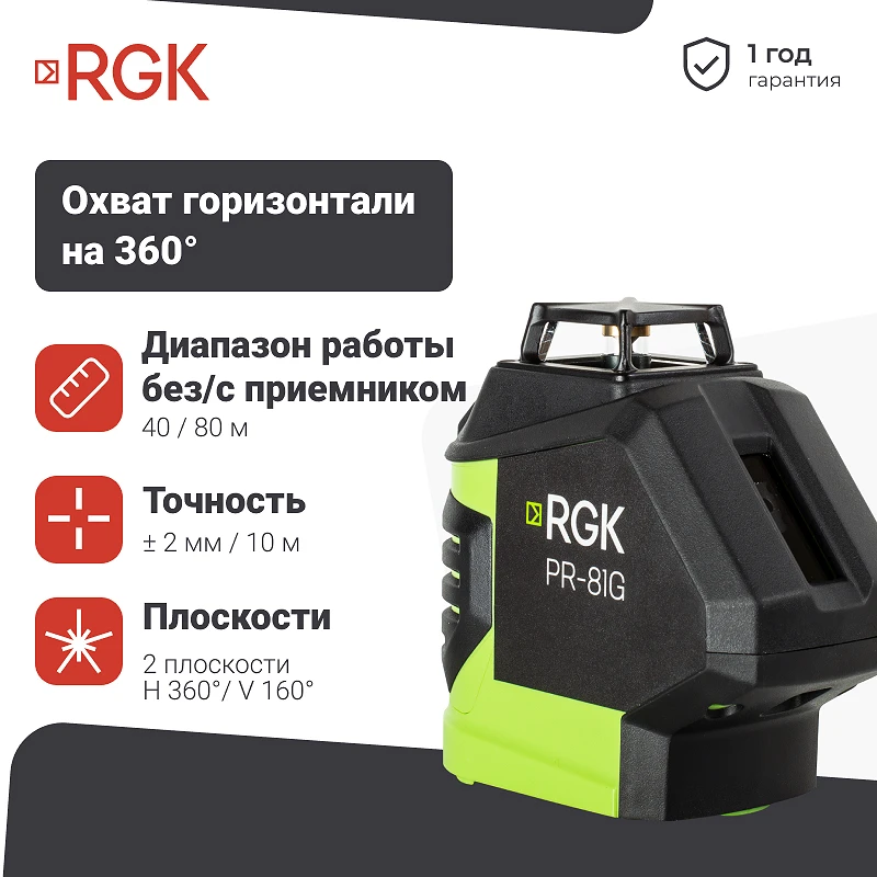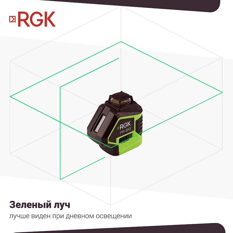 Лазерный нивелир RGK PR-81G проецирует с разверткой в 360 ° вертикальную и горизонтальную плоскости. Модель поддерживает импульсный режим работы, что позволит проводить разметку в больших помещениях или на открытом пространстве. Поставляется в тканевой сумке с трегером и батарейками.