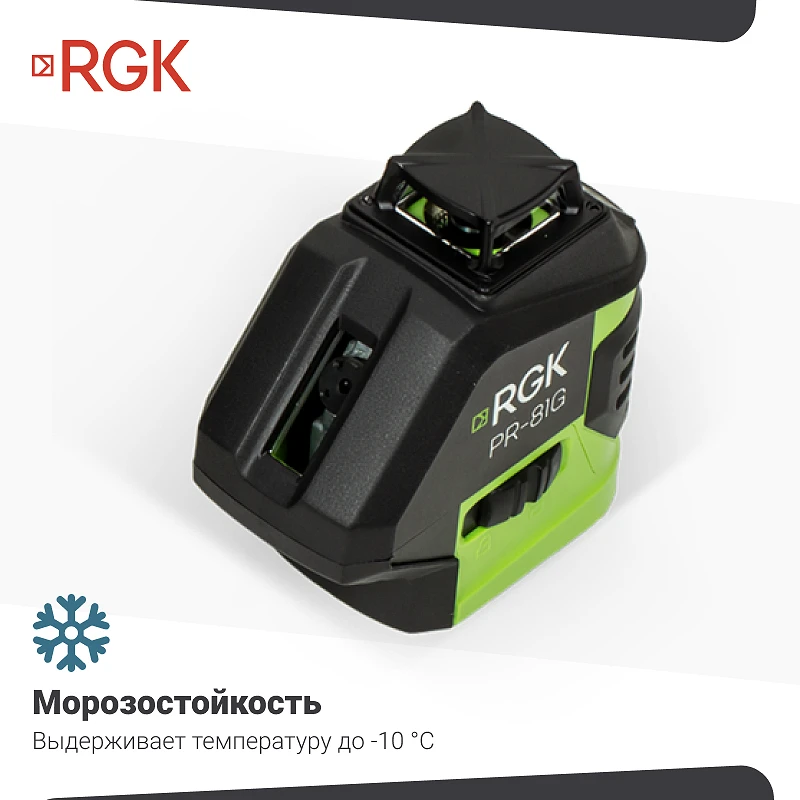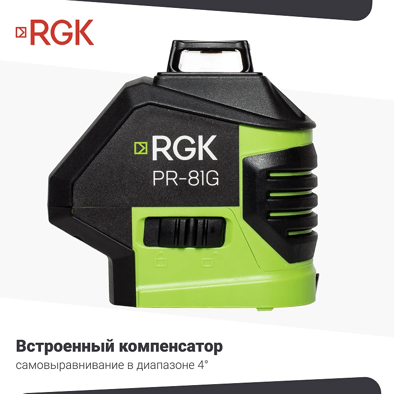 Встроенный компенсатор позволяет ставить лазерный уровень RGK PR-81G на поверхность под наклоном до 4°. В этом случае модель сможет проецировать лазерные линии. При большем отклонении лучи начнут мигать, оповещая о проблеме. В этом случае прибор нужно переставить на более ровное место. Для отключения функции есть боковая кнопка на корпусе, которая блокирует маятник. Это позволит выстраивать лазерные лучи под любым наклоном, а также безопасно перевозить прибор даже при сильной тряске.