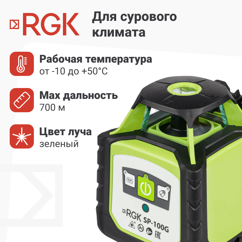 Ротационный нивелир RGK SP-100G используется для определения разности высот, выравнивания и разметки различных поверхностей при производстве строительных, отделочных, ремонтных и монтажных работ. Лазерный уровень с лучом зеленого цвета проецирует горизонтальную линию на 360 градусов с точностью ±1,5 мм на 10 м и вертикальную плоскость, которые отчетливо видны на расстоянии до 30 м в помещении и под открытым небом.