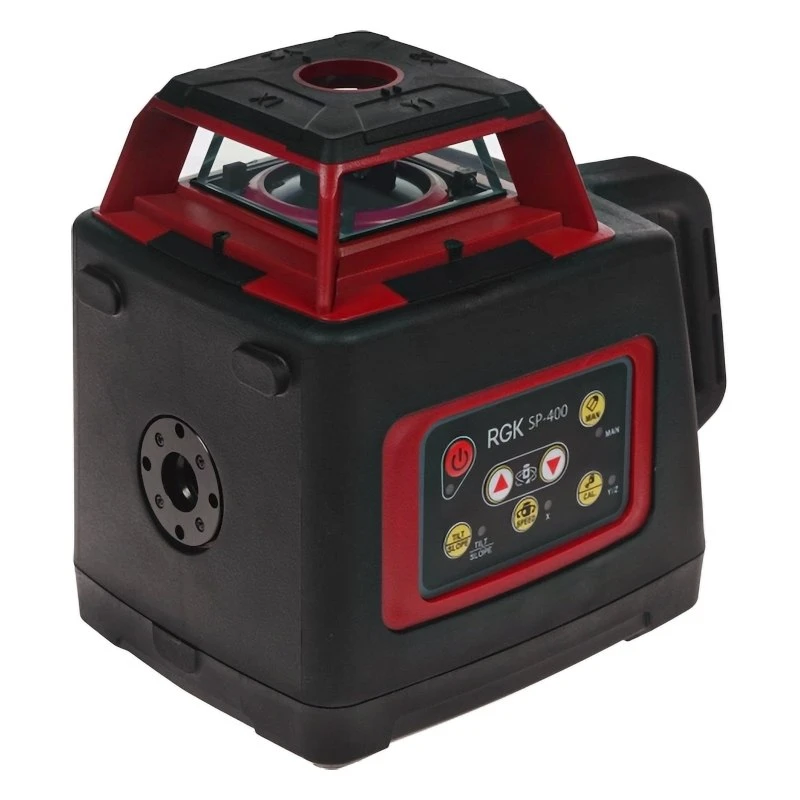 На корпусе ротационного нивелира RGK SP-400 есть два разъема под штатив 5/8 ". Один расположен сбоку, а другой в нижней части корпуса. Если у вас есть тренога, то модель можно закрепить в вертикальном или горизонтальном положении для проецирования лазерных лучей на определенной высоте.