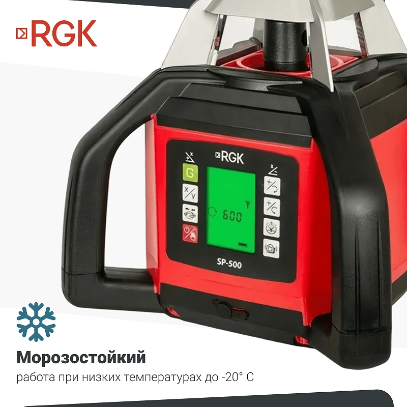 Конструкция нивелира RGK SP-500 рассчитана на эксплуатацию в жестких условиях: рабочий температурный диапазон от -20°C до +50°C. Корпус с защитой IP54 надежно оберегает электронику от строительной пыли и брызг.