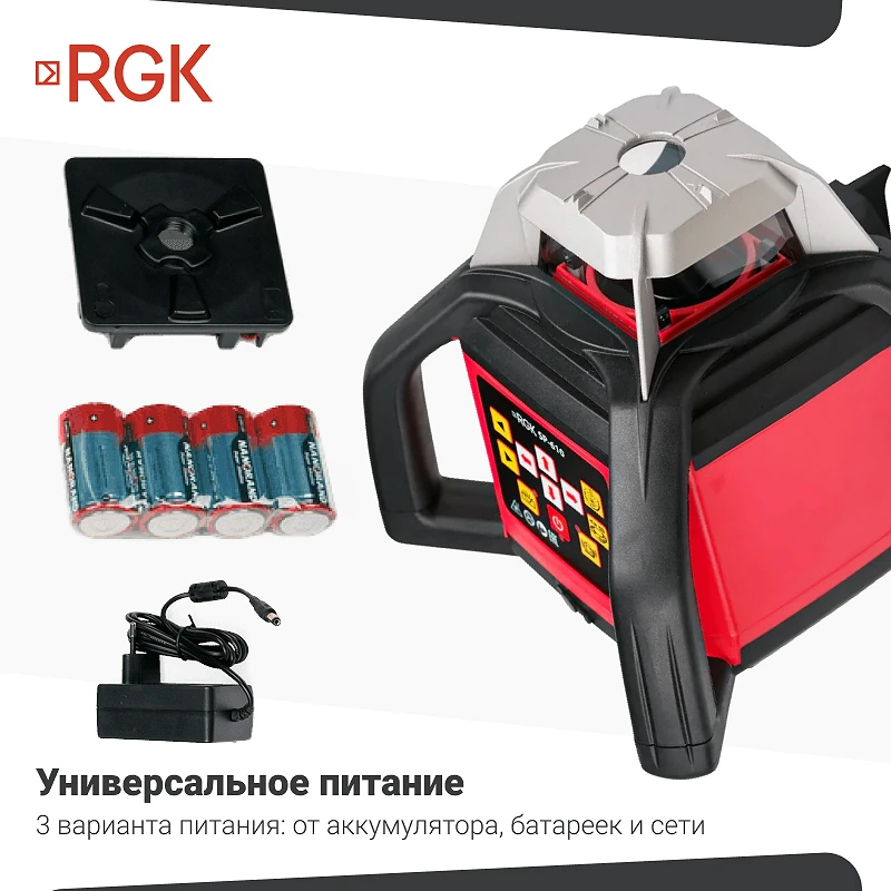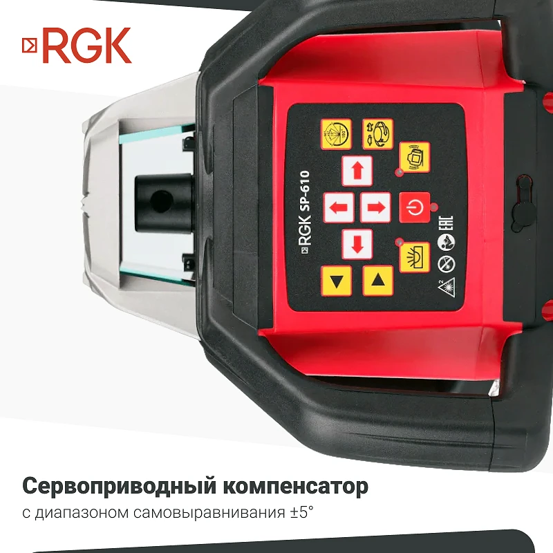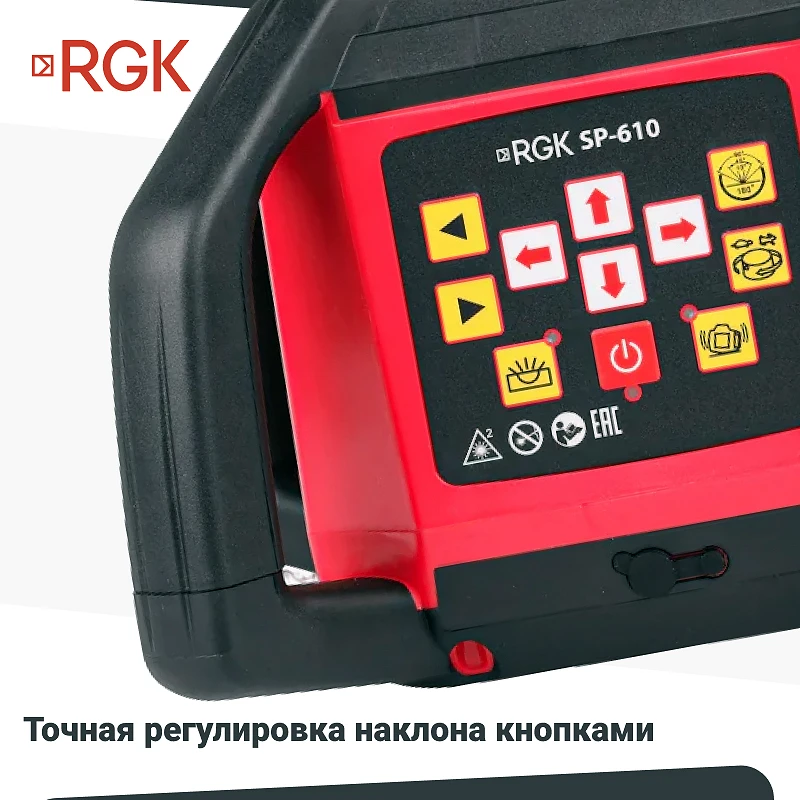 Параметры работы лазерного нивелира RGK SP-610 регулируются как кнопками на приборе, так и с помощью пульта дистанционного управления. Полного заряда аккумуляторов хватает до 24 ч непрерывного использования нивелира. Спустя 10 мин бездействия происходит автоотключение лазерного построителя плоскостей. Это помогает сохранить заряд аккумуляторов, если вы случайно забыли выключить устройство после работы. Прибор соответствует степени защиты IP 64, не боится повышенной влажности или строительной пыли.