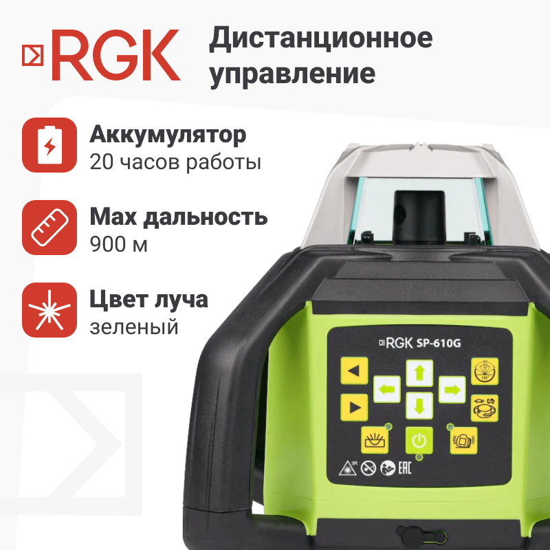 Ротационный нивелир RGK SP-610G используется для выравнивания и разметки различных поверхностей при производстве строительных, отделочных, ремонтных и монтажных работ. Лазерный уровень с лучом зеленого цвета проецирует горизонтальную линию на 360 градусов, вертикальную или наклонную плоскость с точностью 0,5 мм на 10 м, которые отчетливо видны на расстоянии до 30 м при искусственном или естественном освещении в помещении и под открытым небом. При использовании штатного приемника диаметр построения увеличивается до 900 м.