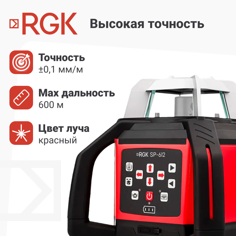 Ротационный лазерный нивелир RGK SP-612 – профессиональный инструмент, разработанный для точных измерений и разметки на строительных объектах. Вращаясь, лазерный излучатель проецирует линии на расстояние до 600 метров. Благодаря прочной конструкции, надежной защите от пыли и воды и вариативности источников питания, прибор идеально подходит для использования в условиях стройплощадки.