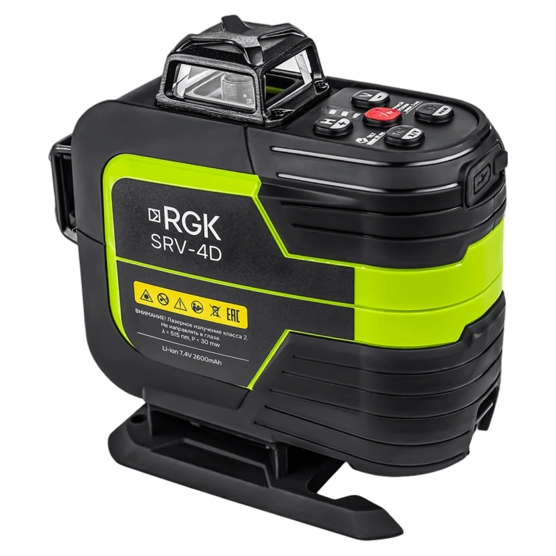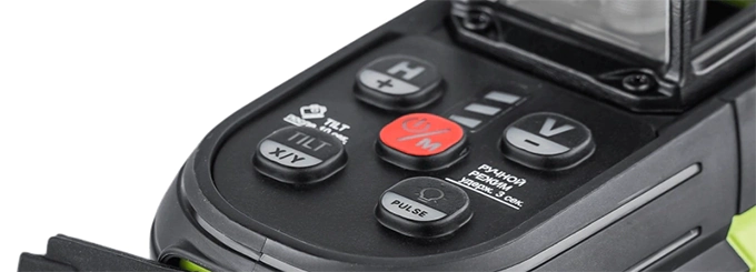 Световые проекции с разверткой на 360º охватывают все помещение, избавляя от необходимости переставлять прибор. Каждую линию можно включать и отключать, чтобы оставлять в работе только необходимые проекции и экономить заряд батареи. Наклон линий можно регулировать с помощью кнопок на панели управления, не наклоняя сам прибор. Яркие зеленые лучи отлично видны при любом освещении, а переключение в импульсный режим с приемником позволяет значительно увеличить дальность действия. Лазерный уровень RGK получает питание от литий-ионного аккумулятора, который обеспечивает 6 часов автономной работы на одном заряде.