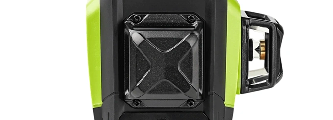 Круговые проекции на 360 градусов позволяют охватить все пространство без перемещения прибора. Функция поочередного отключения лучей помогает экономить заряд батареи, оставляя активными только нужные линии. Регулировка наклона линий осуществляется дистанционно с пульта или кнопок на панели, без изменения положения устройства. Яркие зеленые лучи обеспечивают хорошую видимость даже при ярком освещении, а работа в импульсном режиме с приемником значительно расширяет рабочий диапазон. Литий-ионный аккумулятор обеспечивает длительную работу лазерного уровня RGK в течение 6 часов при всех включенных излучателях.